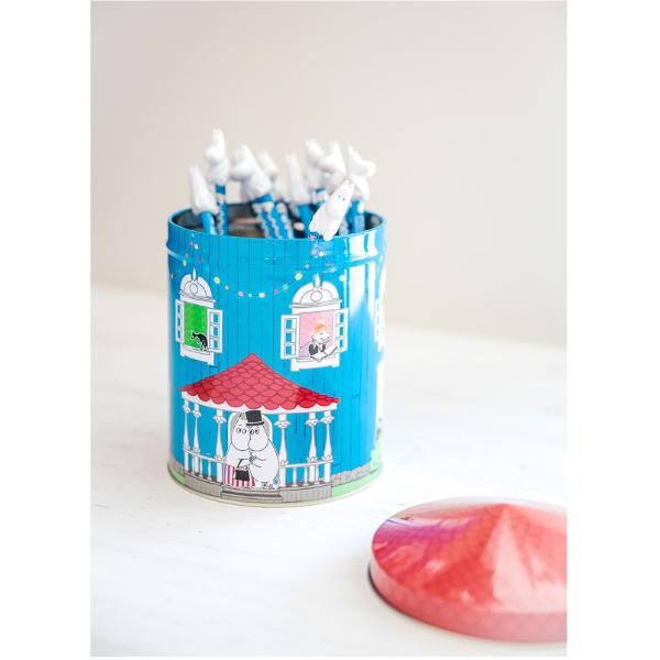 A round tin shaped and coloured like the Moominhouse. The illustration also includes some familiar Moomin characters. Pens, treats, crafts materials, or alike. Keep those knick-knacks organised in a fun Moomin way!